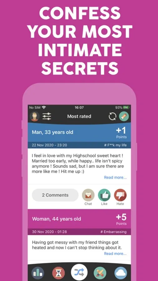 Relief your soul and tell your secrets completely anonymously. Search for secrets, read the comments and chat in total safety remaining anonymous. Share your experiences and connect with others.