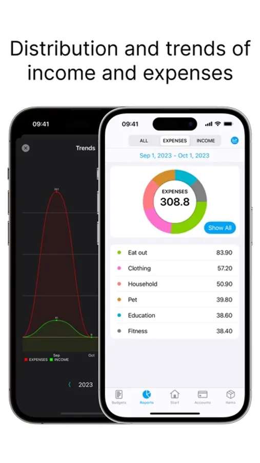 You can view expenditure distribution charts for different time intervals and trend graphs for expenses and income in each category.
