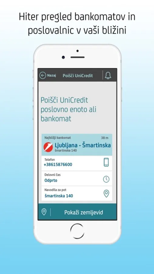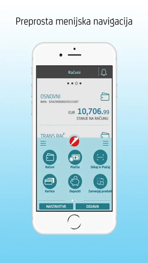 Edinstvena menijska navigacija, ki omogoči intuitivno uporabo s preprostimi kretnjami, zato lahko v polnosti izkoristite vse zmogljivosti vašega Appla. Podrsate levo ali desno znotraj aplikacije in listate med različnimi storitvami. Želite plačati račun oz. položnico? Le tapnete in podrsate navzdol kjerkoli v aplikaciji in začnete. Potrebujete hitri dostop do ostalih storitev? Povlečete UniCredit Bank logotip in z dotikom izberete ikono za želeno storitev.