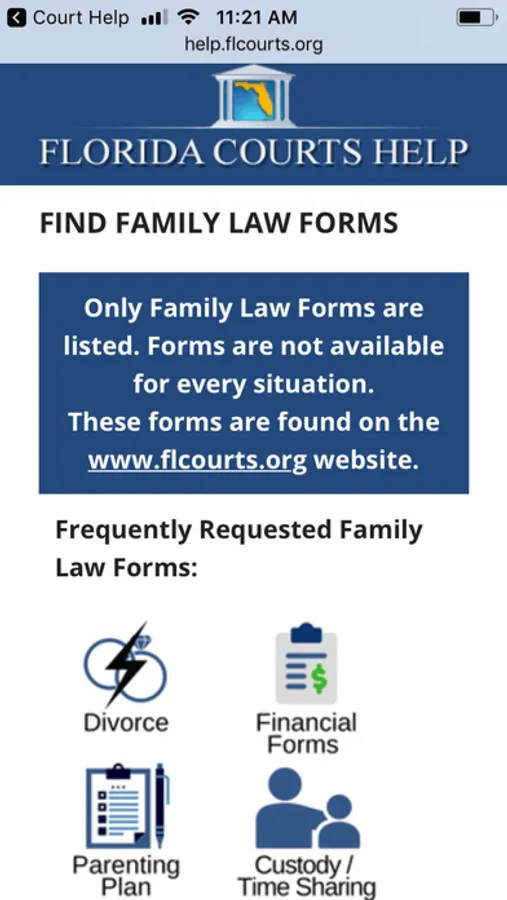 Mobile access to Florida Supreme Court-approved family law forms to ask a court for dissolution of marriage, alimony, protection orders, adoption, determination of paternity, and many more. You can fill out forms on your phone, find out where to get local help, and see answers to frequently asked questions.