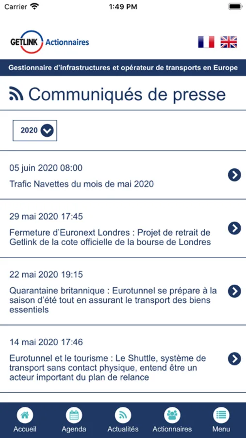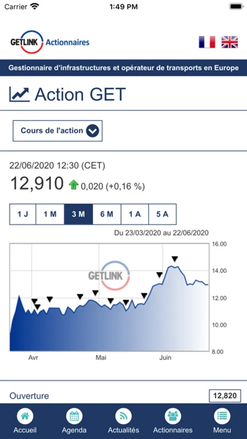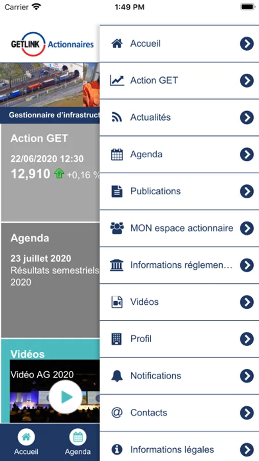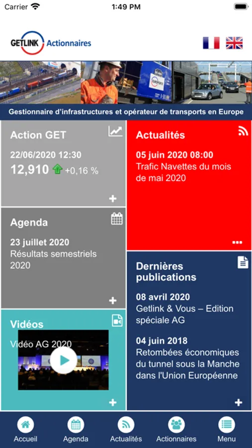 L’application Getlink Actionnaires vous permet de suivre en temps réel toute l’actualité du groupe et d’accéder facilement en mobilité à l’essentiel des informations, notamment le cours de bourse GET*, l’agenda financier, les communiqués de presse, les publications, l’espace actionnaires, les informations réglementées, les vidéos…. Vous pouvez également choisir de recevoir une alerte concernant le calendrier financier et les publications.