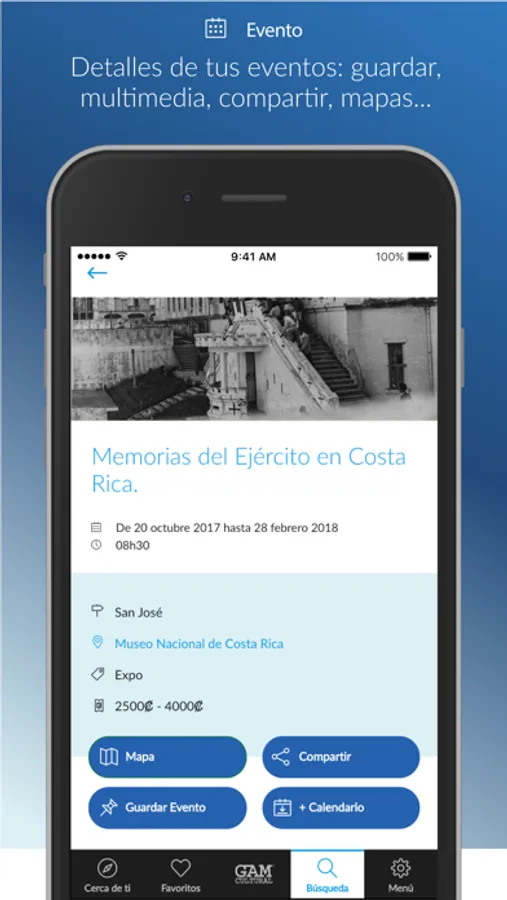 • Obtén detalles de los eventos, incluyendo contenidos multimedia, mapas y direcciones;