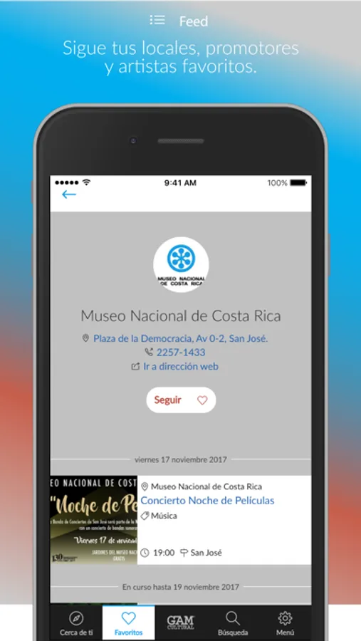Con esta aplicación, GAM CULTURAL no tendrás excusa para perderte ningún evento: Conciertos, teatro, danza, exposiciones, cine, festivales, conferencias, fiestas...