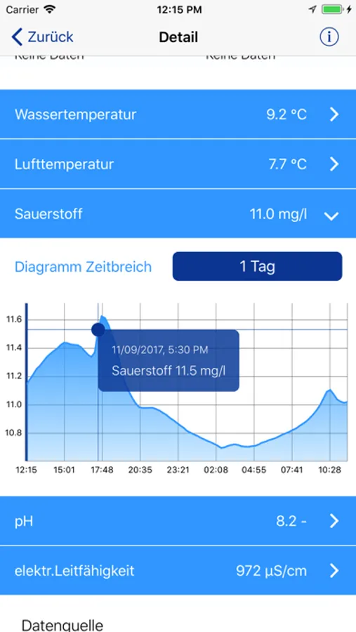 Die detaillierten Grafiken zeigen die zeitliche Entwicklung verschiedener Gewässergüteparameter als Tagesganglinie bis hin zur Jahresübersicht. So lässt sich z. B. der Einfluss besonderer meteorologischer Ereignisse wie Trockenperioden oder Starkregen auf die Gewässergüte erkennen.