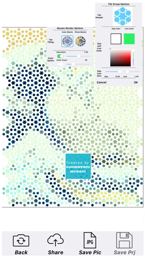 you can share the mosaic design with friends, or printed as a poster, or use it to guide building a ceramic mosaics, whatever.