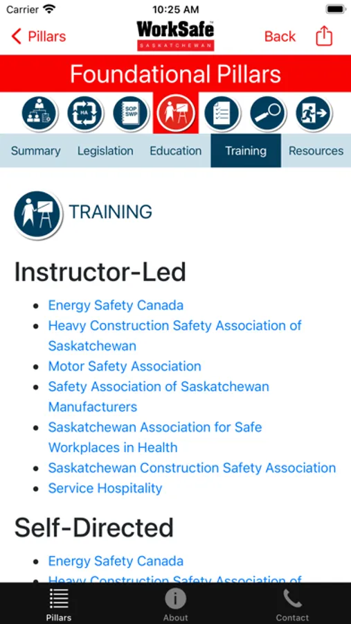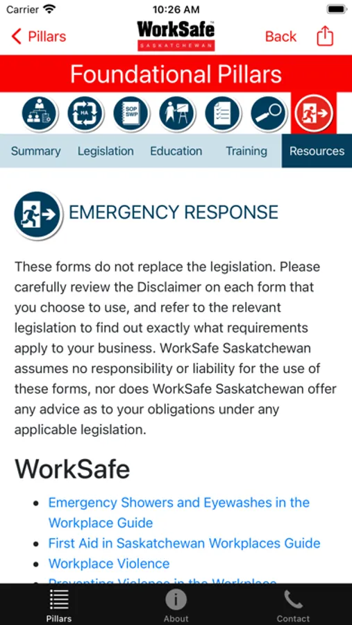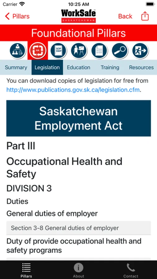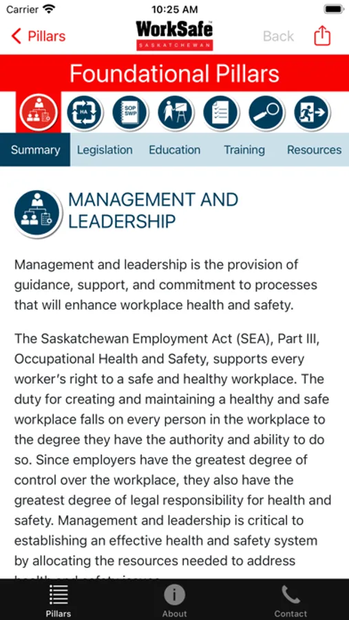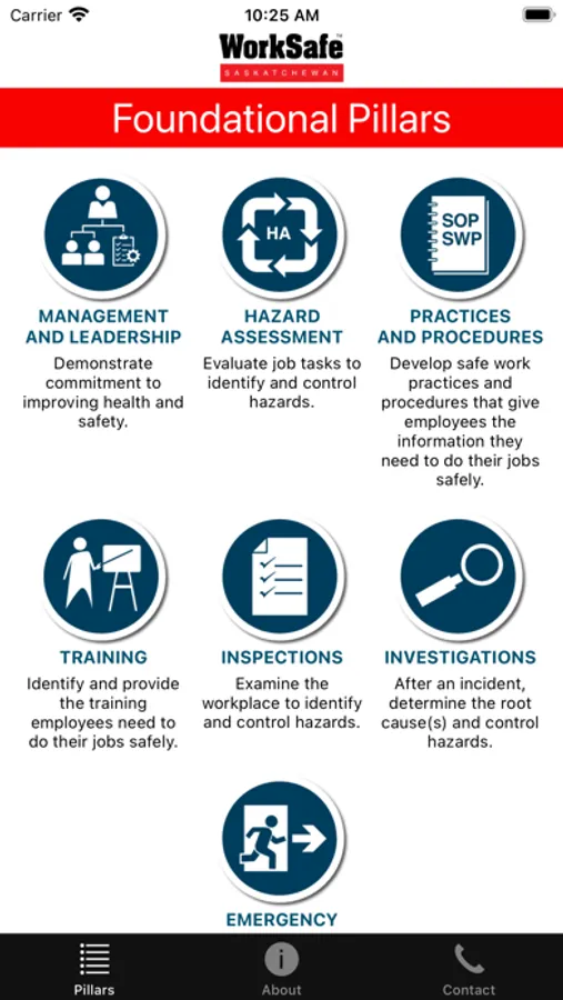 This tool is your guide to the Foundational Pillars of a Solid Health and Safety System. The Pillars include hazard assessment, practices and procedures, training, inspections, and investigations. Each Pillar allows the user to read through a plain language summary, and then link to the relevant legislation itself. Where education and training for each Pillar is available in Saskatchewan is also included. Additional resources such as sample forms, checklists, and report forms for each Pillar are provided. This tool provides information on the Pillars in a summarized format – users should always refer back to the legislation or regulation for specific requirements.