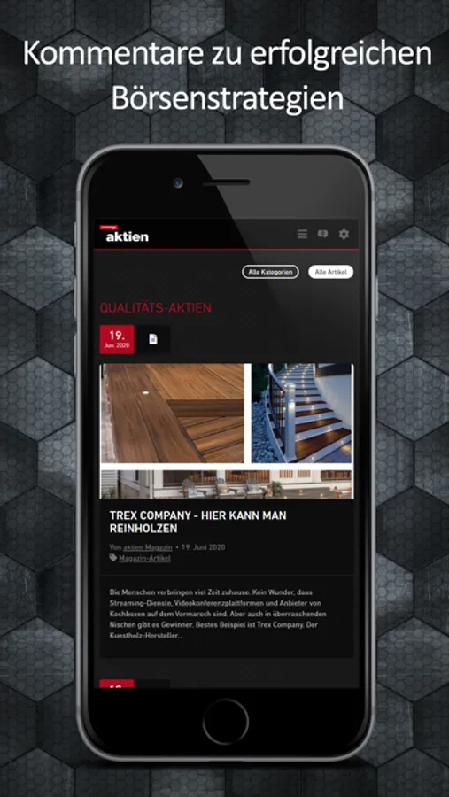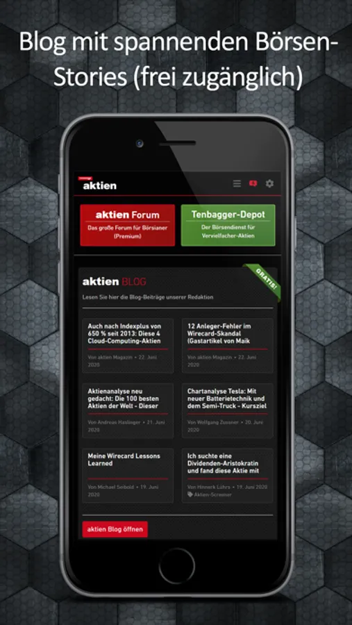 aktien ist der Name unseres Magazins. Wir schreiben darüber wie Sie, liebe Leser, mit Aktien systematisch Geld verdienen können. Unser Fokus liegt auf der regelbasierten und softwaregestützten Suche nach aussichtsreichen Aktien. Die Inhalte dieser App sind: