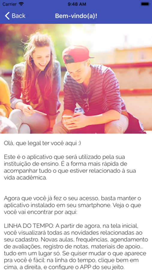 Este é o aplicativo que será utilizado pela sua instituição de ensino. É a forma mais rápida de acompanhar tudo o que estiver relacionado à sua vida acadêmica. Veja o que você vai encontrar por aqui: