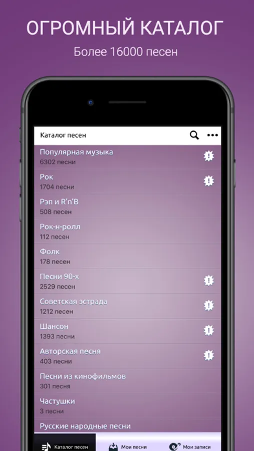 Русское караоке - это не только песни на русском языке, но и на украинском и белорусском языках. Также представлены такие категории песен как русский рок, советская эстрада, фолк, шансон, романсы и многие другие.
