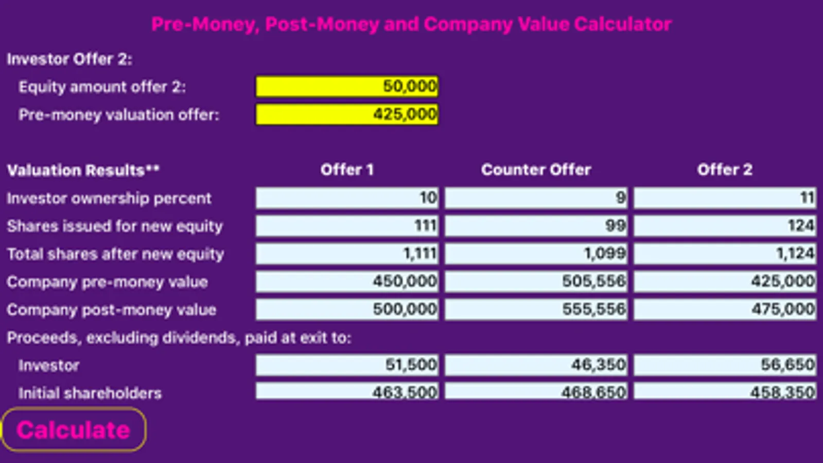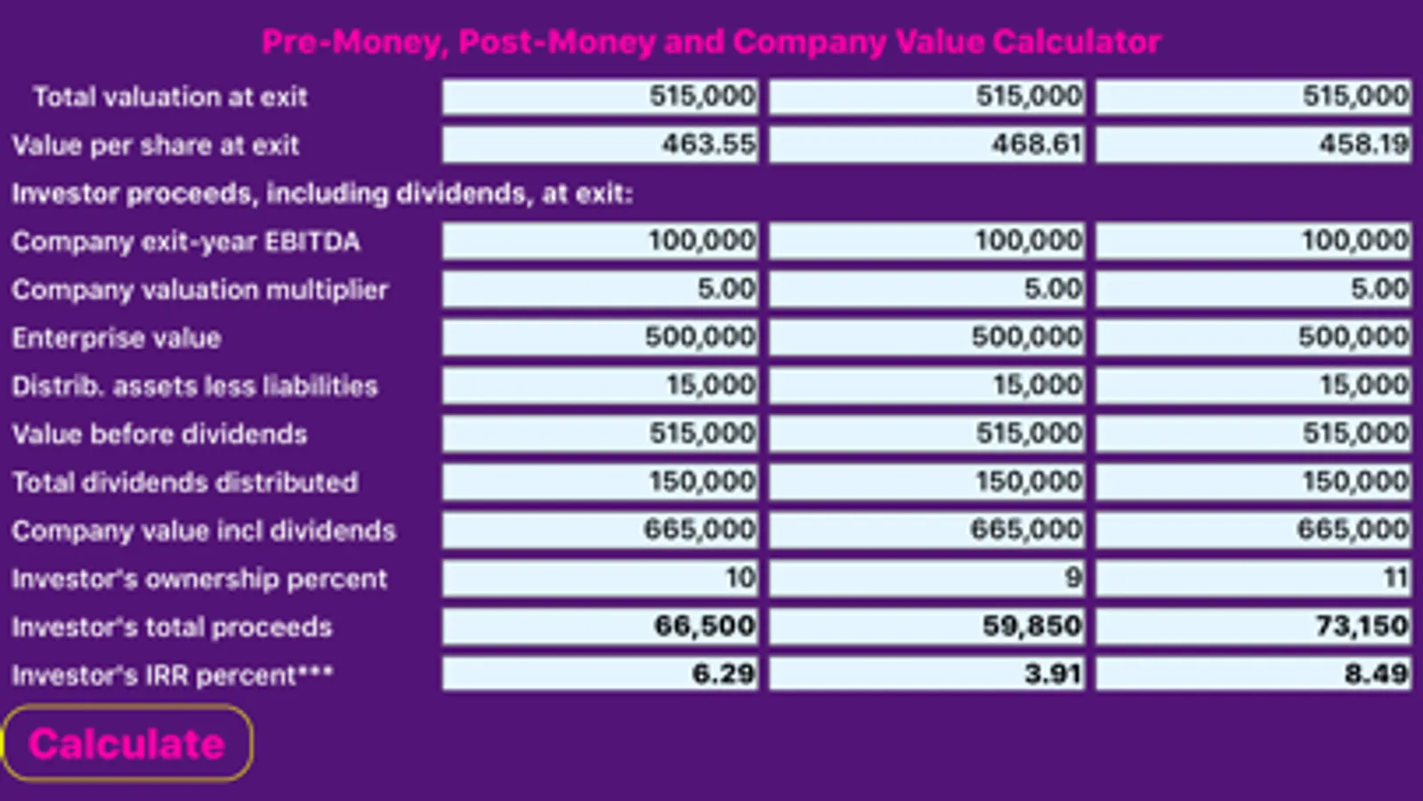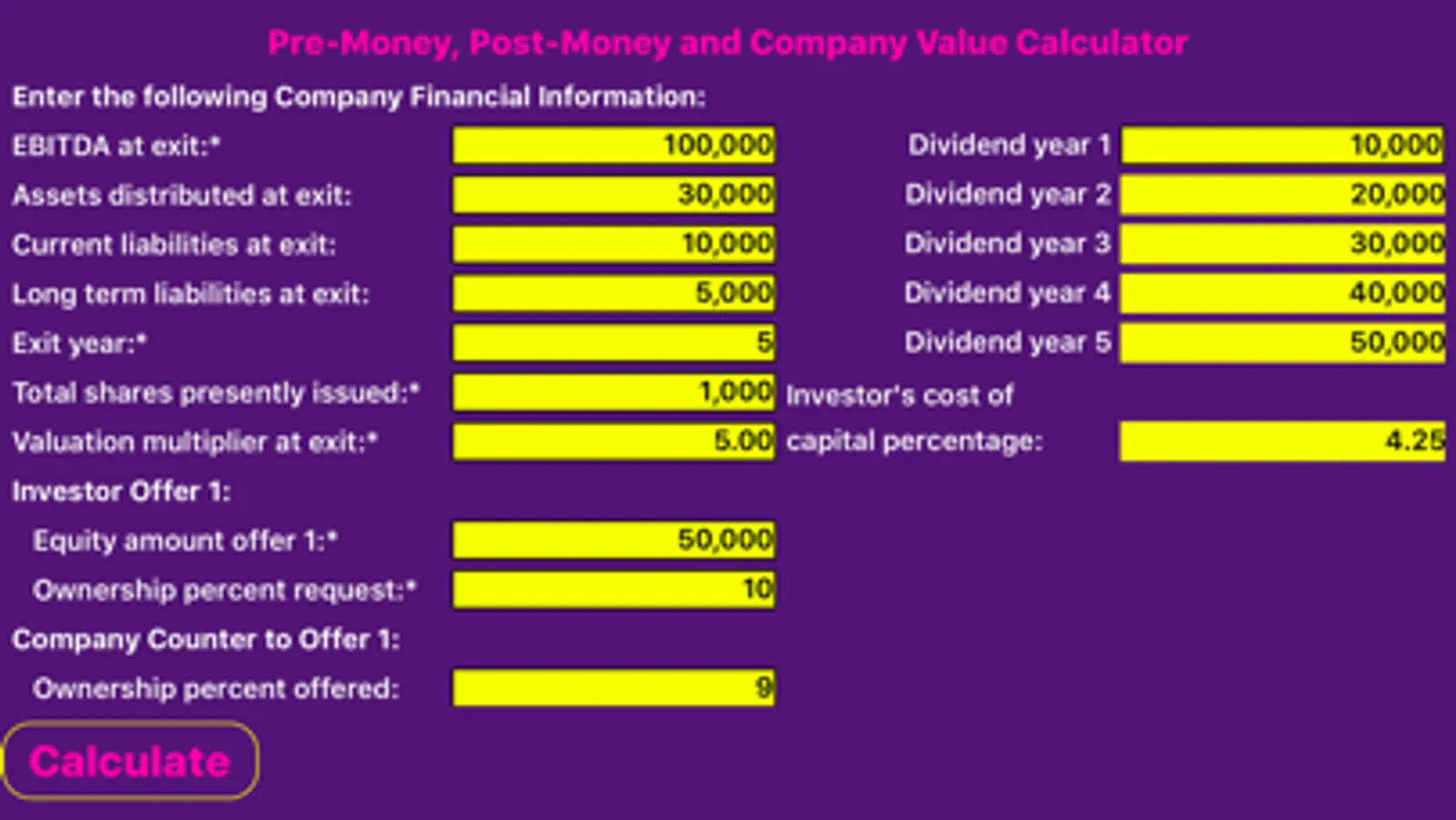 An educational experience for sophisticated users, CoValue, the Company Valuation Calculator, compares an investor's equity infusion, ownership demands and pre-money capital stock purchase offers to company counter offers. Employing an exit-year strategy, financial data, such as Earnings before interest, taxes, depreciation and amortization (EBITDA), is extended by the generally recognized multiple of earnings method to arrive at an exit year enterprise value for the company. Enterprise value is then adjusted for dividends received over the investment period, assets not included in the exit year transaction (such as investments) and current and long term liabilities that must be satisfied upon exit, to arrive at adjusted net proceeds. The investor's internal rate of return (irr) is then calculated by comparing the net proceeds available upon exit to the original investment. The investor's net present value is also calculated to determine investment feasibility based upon the investor's cost of capital.