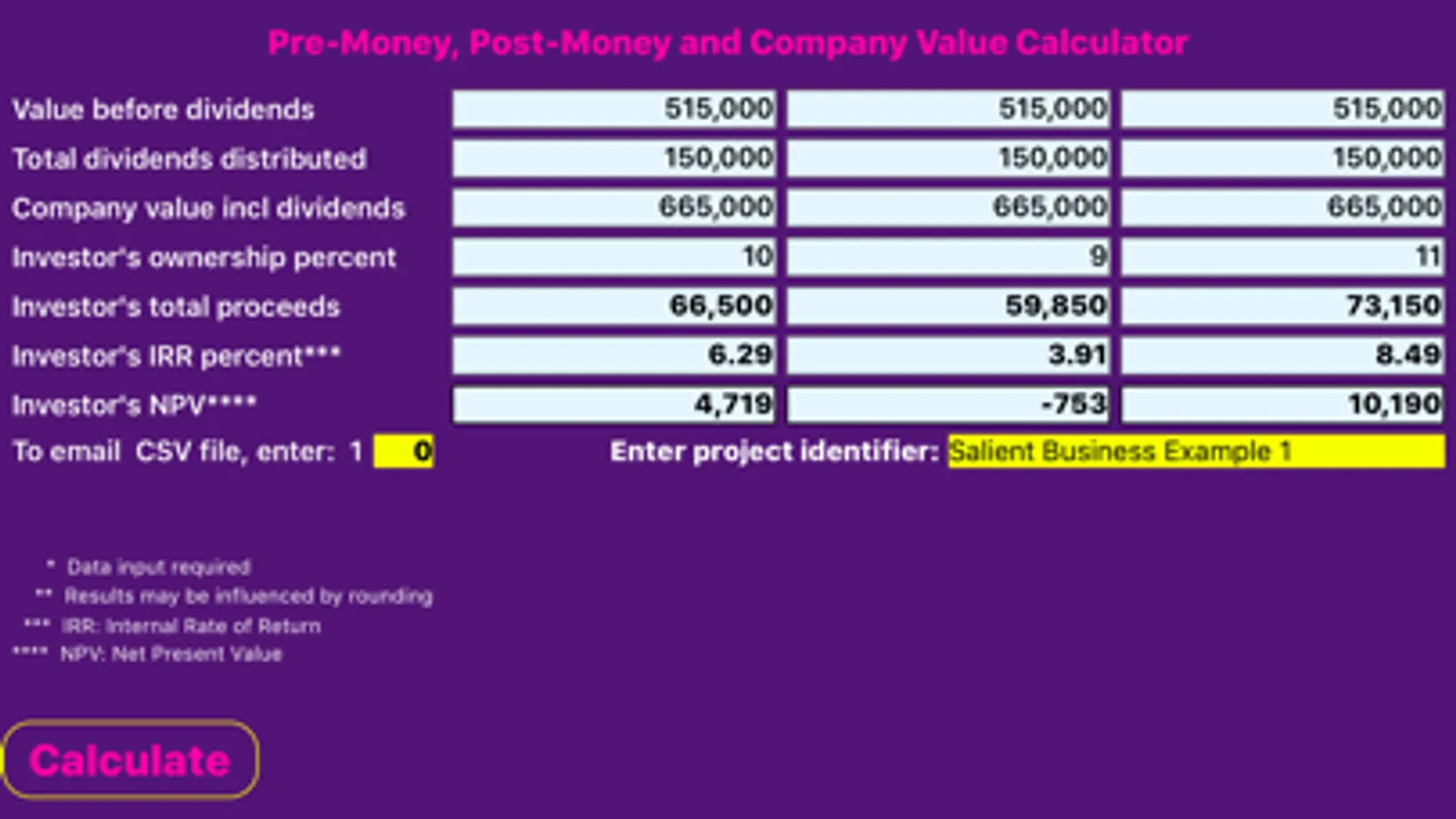 The Company Valuation Calculator also provides a quick and easy method to perform sensitivity analyses for various levels of investments and ownership percentages. A comma separated value (.csv) file can be emailed from the app for reference and to perform additional spreadsheet analysis.