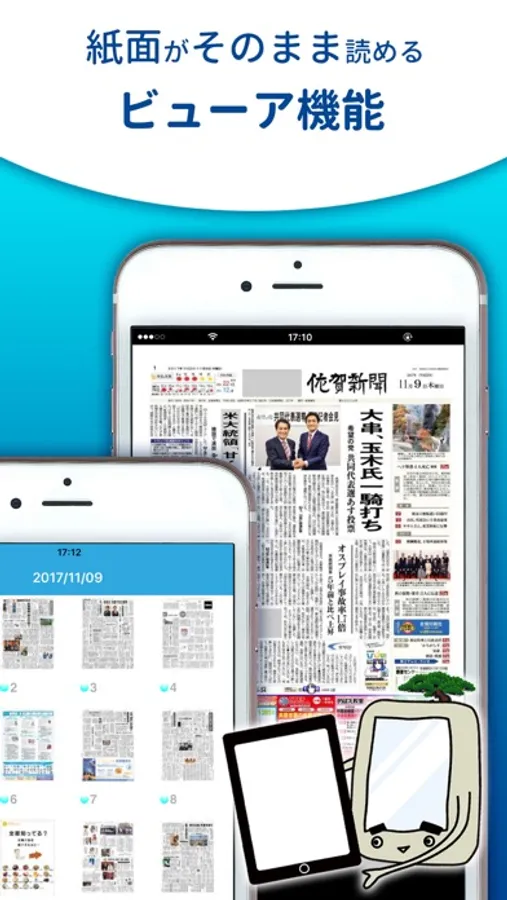 紙面ビューアを内蔵しているので、当日の朝刊や別刷り紙面をそのまま開くことができます。長押しでテキスト表示も可能です。
