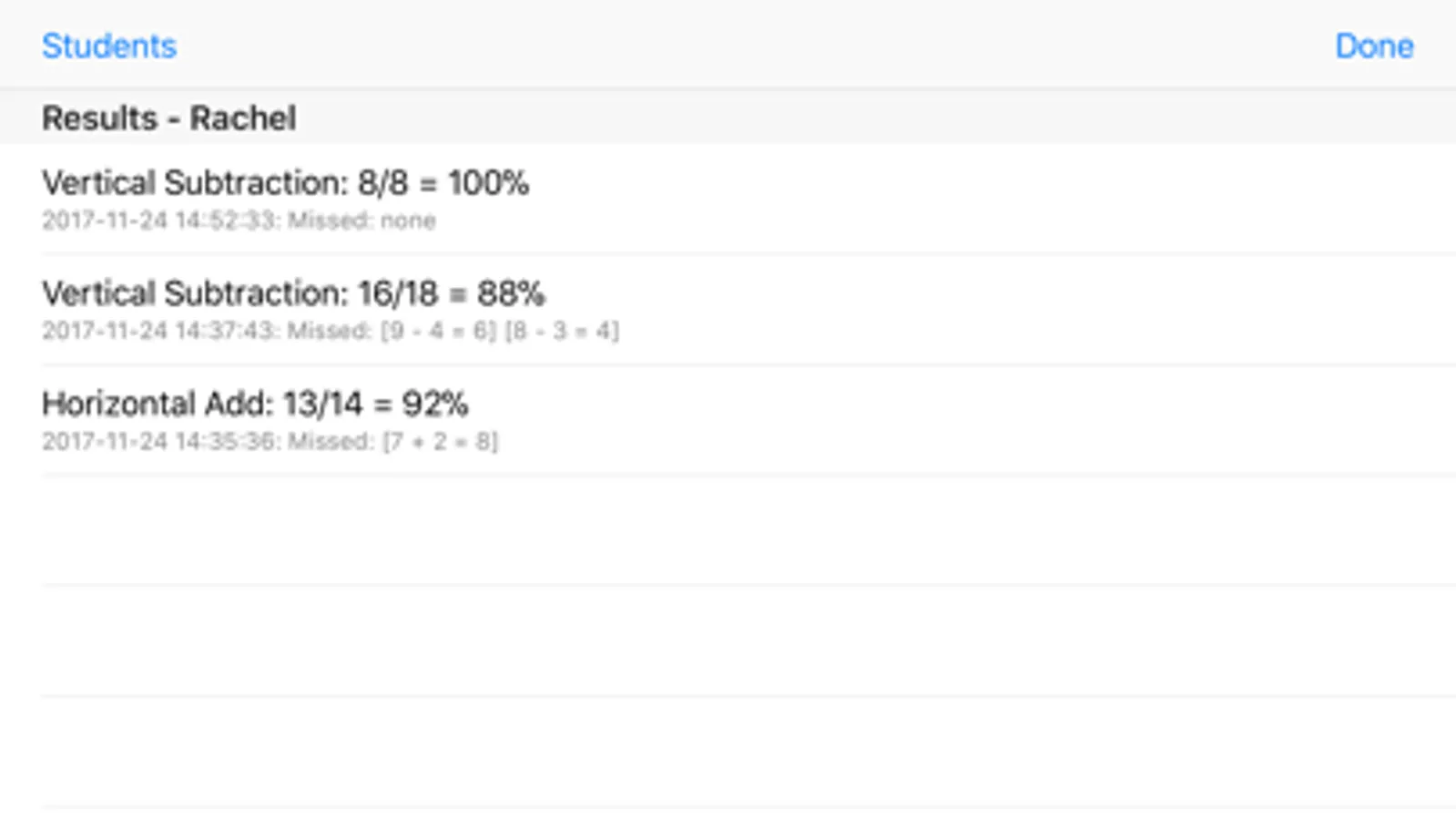 Both vertical and horizontal addition and subtraction problems are included. You can choose the range of numbers used in the addition and subtraction math problems. Enter the student’s name to track their progress. An unlimited number of students can be added.