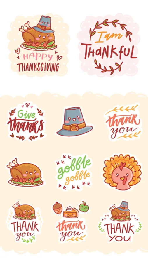 Specially drawn stickers for Thanksgiving Day with cute doodle illustrations and lettering! Have a great Thanksgiving Day!