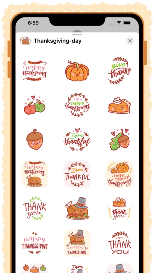 Set of 36 hand drawn stickers with cute Thanksgiving Day illustrations ;) * If you like this stickers, please check out my other packs by clicking on Developer button on this page - there are a lot interesting stuff too! :)