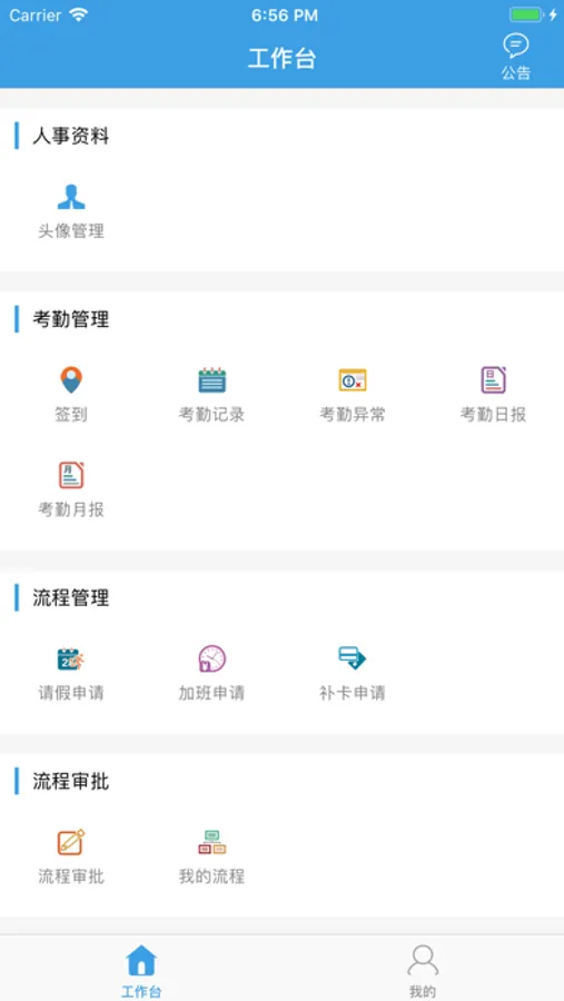 员工可通过“e7考勤”App进行考勤(定位+拍照)、请假、审批等日常事务操作,并可查看个人的考勤数据等报表。员工考勤异常、系统发布的公告也可及时推送到App通知员工。