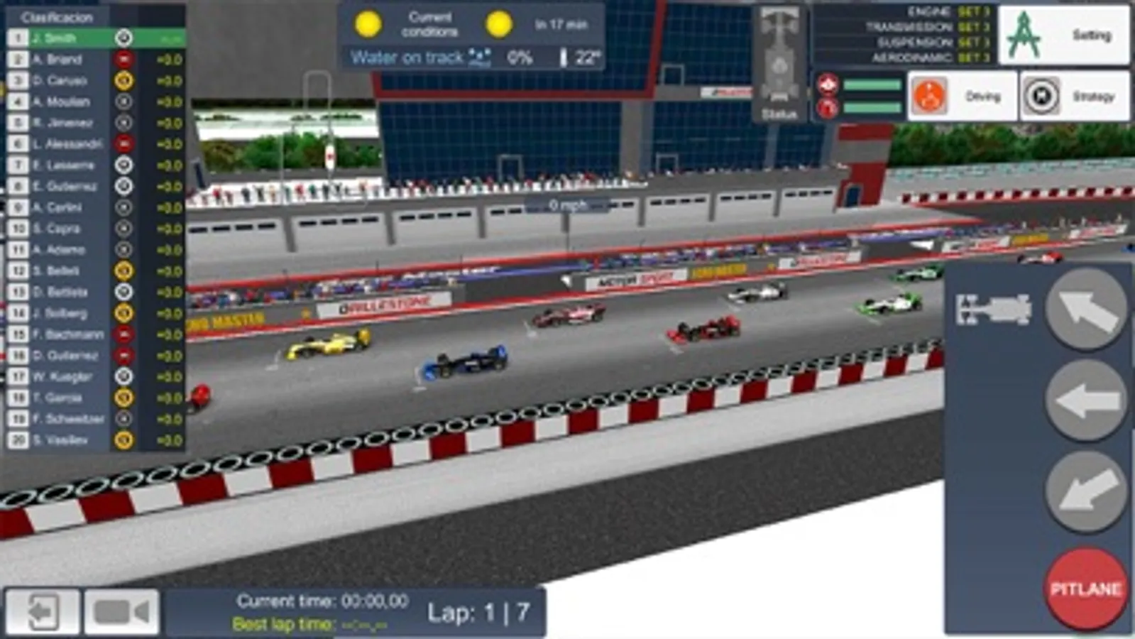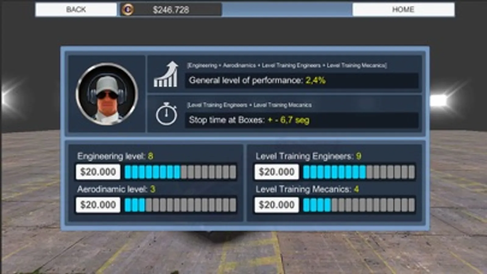 Develop and upgrade your team to increase performance during races. A very important factor is the training of the mechanics to decrease the time of the pit stops.