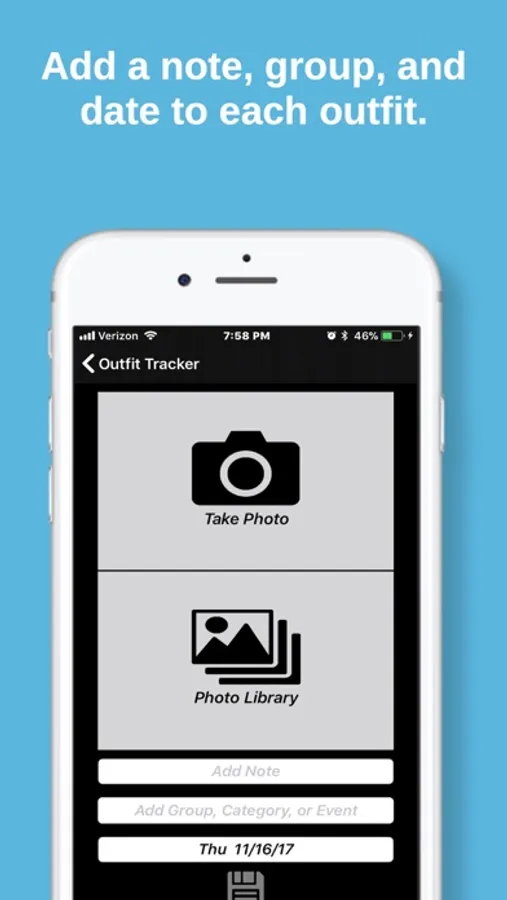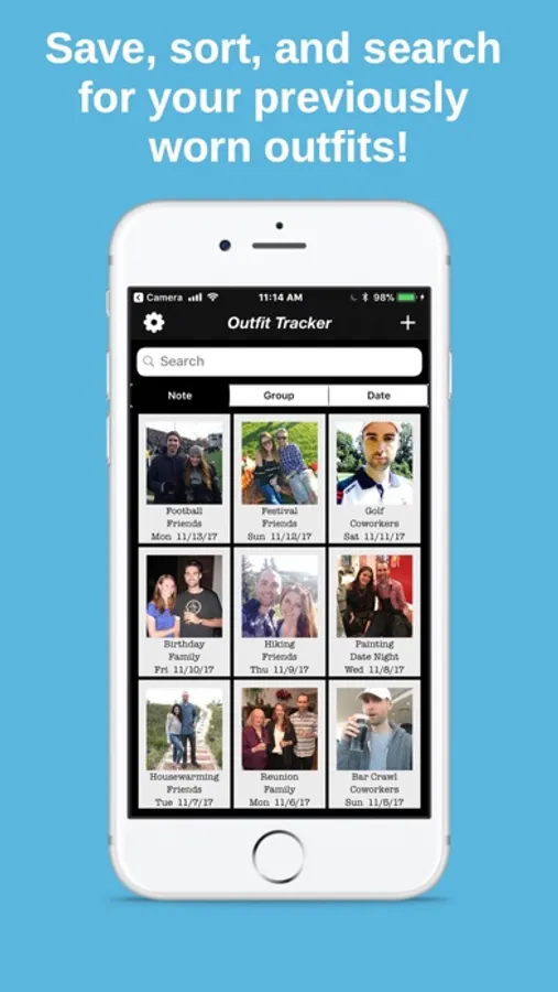 Take photos of your outfits and track your wardrobe. Log, sort, and search for previously worn outfits by the corresponding note, group, and date that you assign.