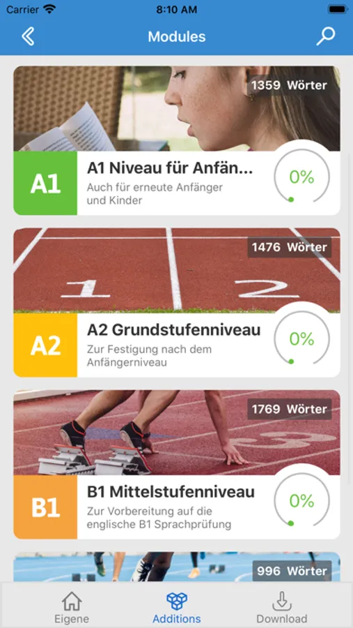 Das Programm leistet beim anstrengendsten und längsten Teil des Sprachenlernens eine spürbar große Hilfe! Momentan werden folgende Niveaustufen der englischen Sprachprüfung unterstützt: A1 (1300 Wörter), A2 (1400 Wörter), B1 (1700 Wörter), B2 (1000 Wörter).