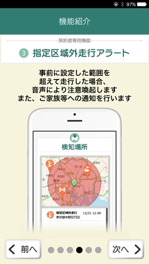 事故につながりやすい危険運転を検知した場合にアラートでお知らせします。また、専用の車載器と接続することで、当社指定の高速道路等において逆走を検知した場合や、あらかじめ設定した指定区域の外での走行を検知した場合には、アラートでお知らせするとともに、見守り者にもメールでお知らせします。