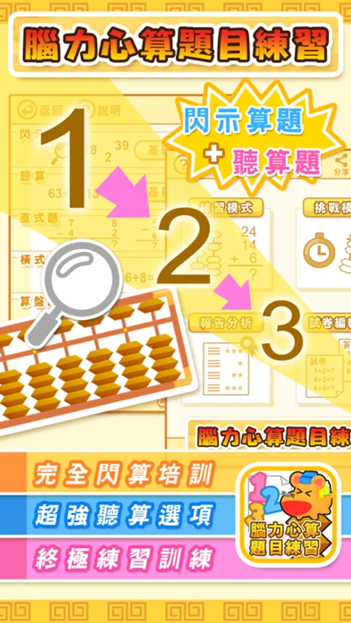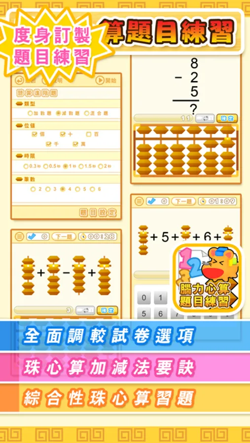 腦力心算題目練習(繁體中文 國語/粵語音效),提供珠心算訓練的閃示(暗算)及聽算題目。同時提供針對珠心算的四個加法要訣及四個減法要訣的題目鍛鍊。