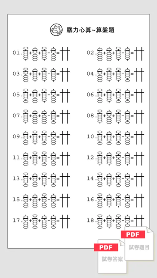 - 閃示算(暗算)、聽算、針對珠心算加減要訣的題目