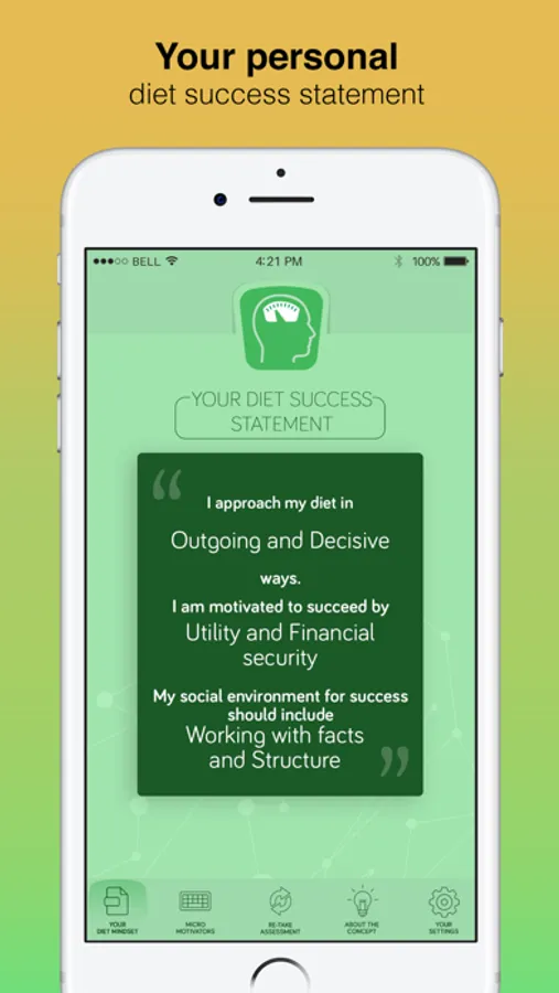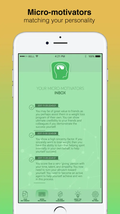 It is a brief (less than four minutes) self-assessment that you take online. Then, you receive a drip-feed of three micro-motivator messages per week (M, W, F) with just-in-time delivery of just what you need to stay motivated and to maintain your Diet Mindset for optimal success with ANY weight loss program that you’re using.
