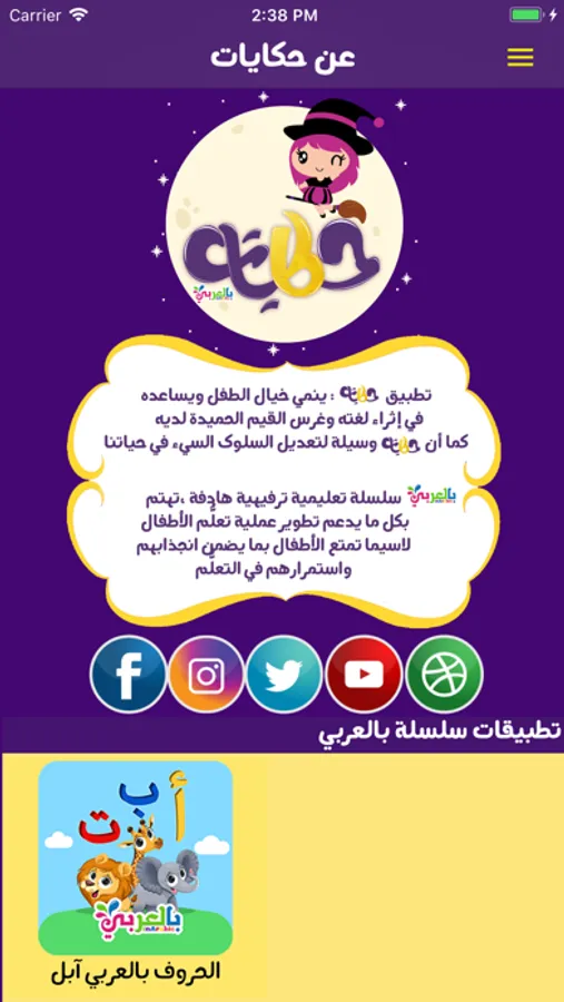 * يهدف تطبيق قصص وحكايات بالعربي لتوطيد العلاقة بين كل أب وأم وصغارهما... بفتح مجال للحوار بينهما، من خلال قصص عربية وقصص تربوية هادفة، لتنمية خيال الطفل وتعليم الاطفال الأخلاق الحميدة والسلوك الحسن.
