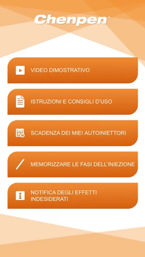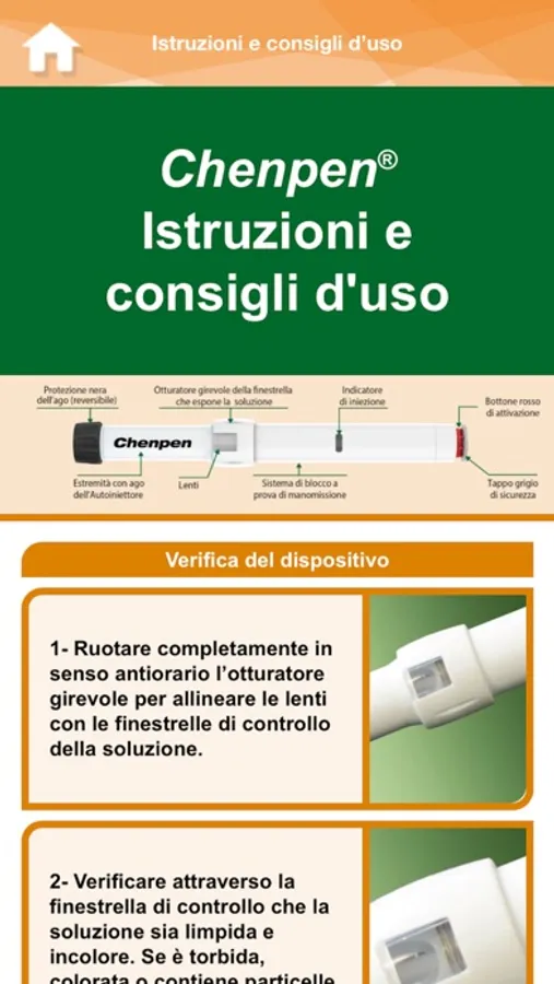 l'Applicazione ha lo scopo di illustrare utilizzo dell’autoiniettore Chenpen; è dedicata ai pazienti e a chi li aiuta e li assiste per comprendere come utilizzare il dispositivo con video dimostrativi, con una descrizione dei vari passaggi dell’impiego dell'autoiniettore e con una simulazione che aiuta a ricordare tali passaggi. La App permette inoltre di memorizzare la scadenza dell’autoiniettore e di programmare un avviso che ricorderà quando sostituire l'autoiniettore.