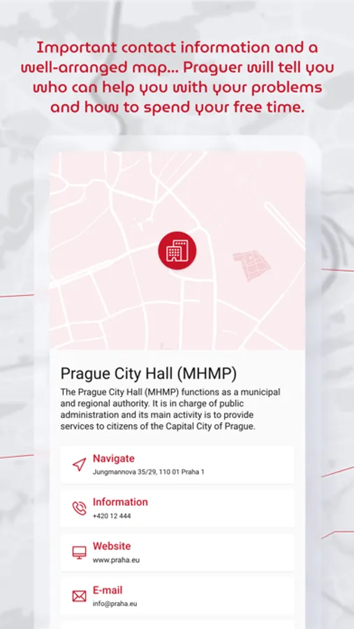 Po stažení aplikace budete mít neustále po ruce praktického průvodce, který se stane Vaší oporou při řešení různých situací spojených s životem v Praze. Pomocí přehledného rozcestníku si snadno vyhledáte tematicky rozdělené základní informace a kontakty na jednotlivé organizace a instituce, kde Vám zodpoví Vaše další dotazy. Součástí aplikace je také mapa, na které můžete naleznout relevantní instituce ve Vašem okolí a vyhledat si nejrychlejší cestu k Vašemu cíli.