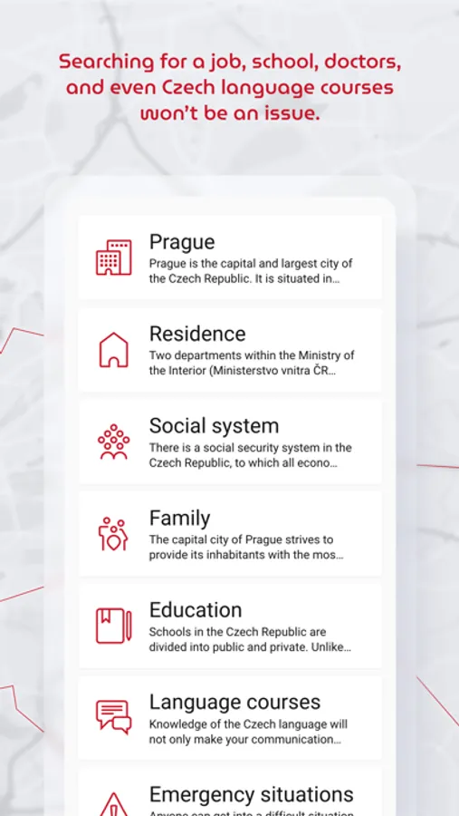 After downloading the application, you will always have a hands-on guide that will become your support for dealing with various life-related situations in Prague. A well-arranged signpost will help you find thematically divided basic information and contacts to certain organizations and institutions which may solve your problems. The application also includes a map where you can find relevant institutions in your area and the fastest way to your destination.