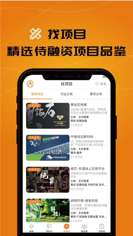 1、在商城版块中,优质项目的产品展示,促成线上交易。