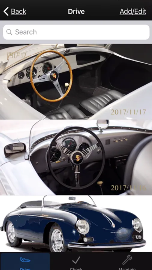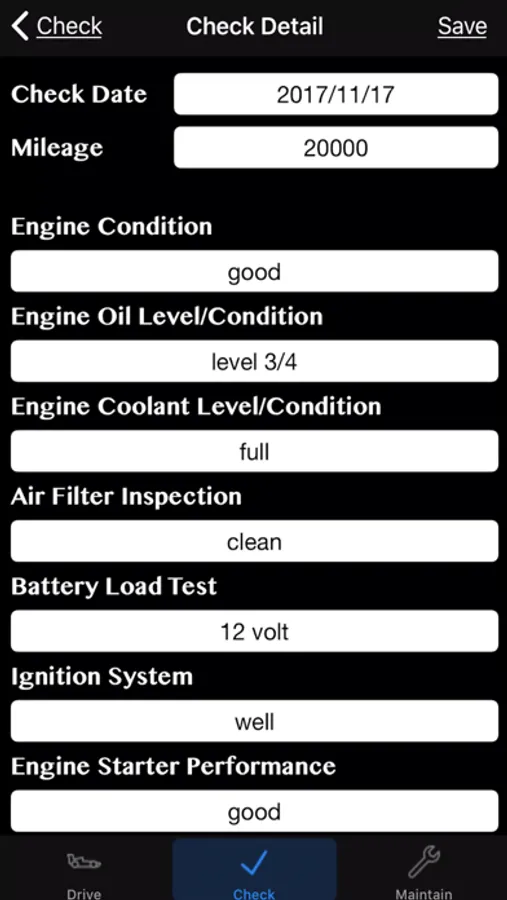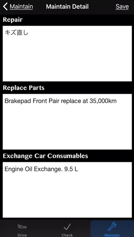 アプリは、ドライビングの記録、カー・チェックの記録、メインテナンスの記録ができます。