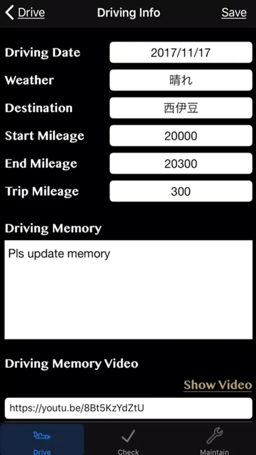 ドライビング記録では、ご自身の撮影した思い出のビデオをYouTubeにアップロードし、そのURLをアプリに貼付することによりいつでも御覧になれます。ドライビングの思い出とフォトも同時に記録できます。