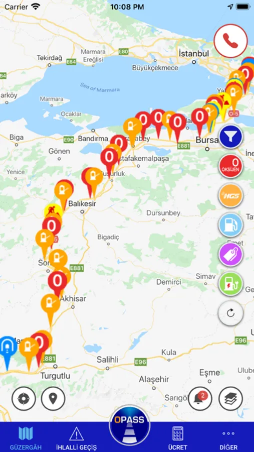 • Çağrı Butonu: Ana ekranın sağ üst köşesindeki kırmızı renkli çağrı butonu ile acil bir durumda “Otoyol Acil Yardım Merkezi”mize ya da ücret toplama ile ilgili bir sorunuz olduğunda “Ücret Toplama Çağrı Merkezi”mize kolayca ulaşabilirsiniz.