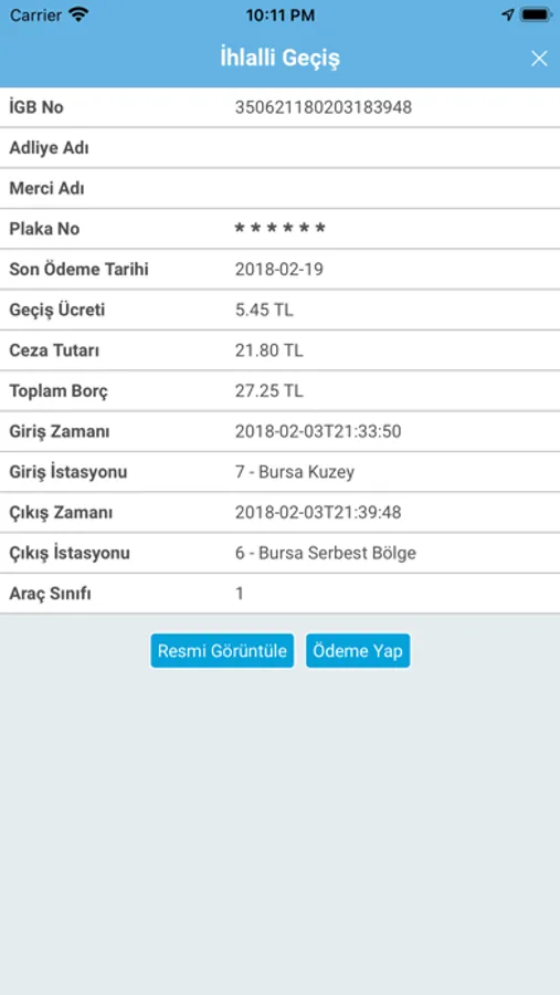 İHLALLİ GEÇİŞ: Bu sayfada ihlalli (ödemesiz) geçiş durumlarını sorgulayabilirsiniz. Sorgu sonucunda varsa seçeceğiniz bir ihlalli (ödemesiz) geçişin geçiş anı fotoğrafı dahil olmak üzere tüm detaylarına ulaşabilir, seçtiğiniz geçişlerin ödemelerini kredi kartınız vasıtası ile hemen yapabilirsiniz. Ayrıca, bu sayfaya 5 adete kadar araç plakası kaydedebilir ve uygulamanın “bildirim alma” özelliğini açmanız halinde, kaydetmiş olduğunuz araçlara ait ihlalli (ödemesiz) geçişe ait bildirimleri kontroller tamamlandıktan sonra otomatik olarak alabilirsiniz.