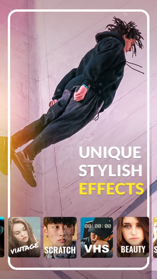 - Endless variety of video effects and camera filters including Retro, Vintage, Chromatic, glitch, distortions, mirrors, VHS, beautify, blends, collages, duo-tone and pixel effects.