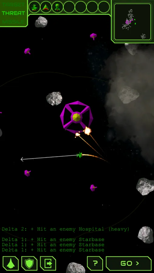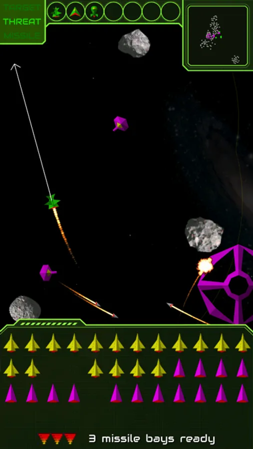 You fight enemy spaceships using six different types of missiles which home in on the nearest target, so you have to be careful not to destroy your own friends...