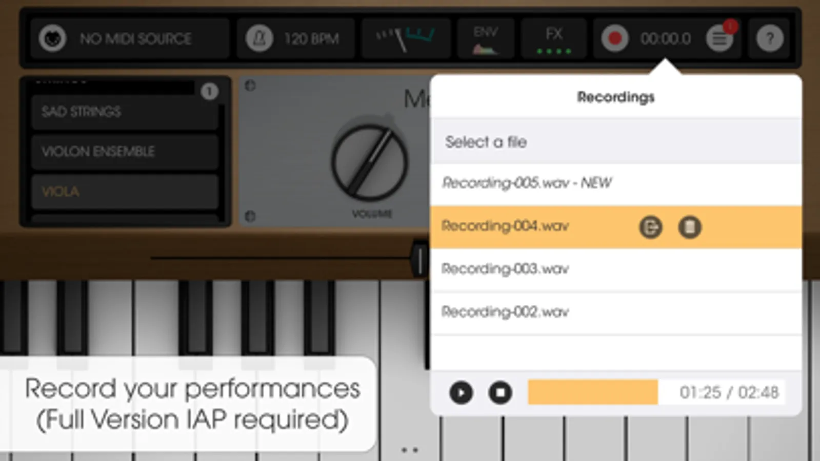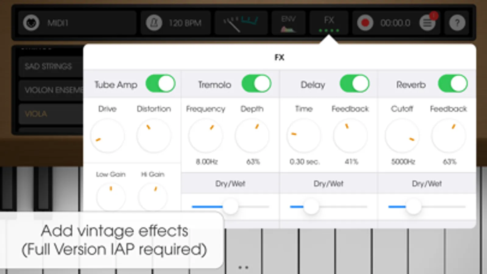 Get the « Full Version » IAP to get all the 18 instruments, including : Electric guitar, Vibraphone, Sad Strings, Piano, Choirs, and more (FX & Live Recording).