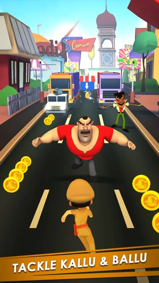 Join India's youngest supercop Little Singham in his biggest battle between the good and the evil against the vilest demon of them all, Kaal. Play with 9 different avatars of Little Singham - Police, Army, Navy, Air Force, Military, Cricketer, Petrol Man, Miner and Makkhi. Travel beyond Mirchi Nagar. Run through the streets of Bhutan and Tashangarh. Explore the new Convention Centre and collect as many coins you can. Slide through concrete pipes. Jump over incoming cars and barricades. Tackle through Kallu and Ballu to stay out of their reach and get back on your quest to capture Kaal. Grab Magnets on the run to collect all the nearby coins. Seize the Bulletproof Jacket and run through obstacles. Power Boots boost up your speed and help Little Singham narrow down the distance between him and Kaal. Do not forget to nab the Rockets on your way. They help you collect easy coins. Coins can be used to upgrade your Power-ups to last longer.