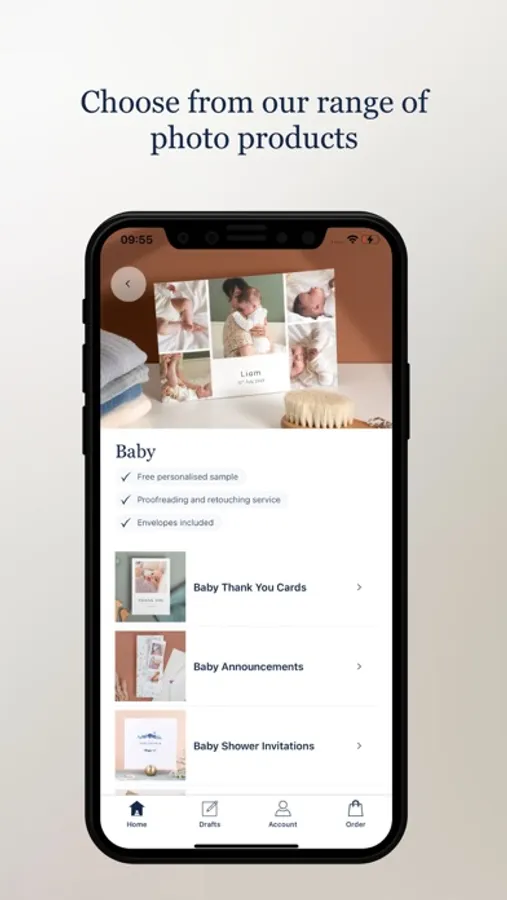 Whether you are looking to immortalise everyday moments of joy with your family, record your latest adventures or share warm wishes with your loved ones, create unique photo products and cards directly from your mobile phone. Simply choose your favourite design, upload your photos, adjust the layout, add your text and voilà, a stunning photo product for you to cherish. Want to finish personalising your creation on your computer or tablet? Connect to your account to continue editing your draft online.