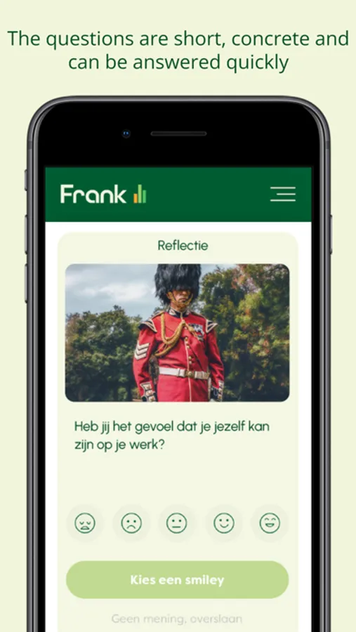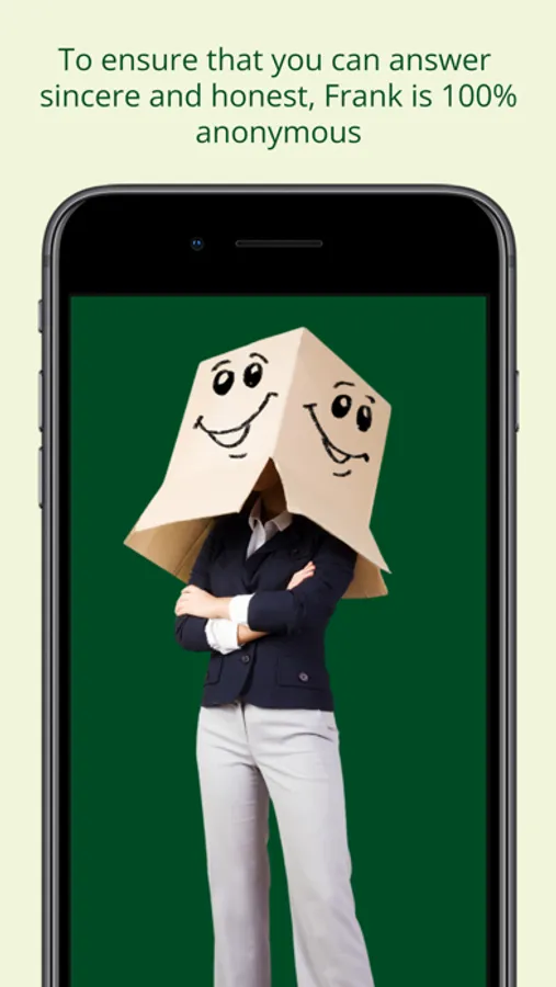 We want you to be honest, so your privacy is guaranteed! What you tell Frank is 100% anonymous. The information your employer receives is only at group level and can never be traced back to you personally.