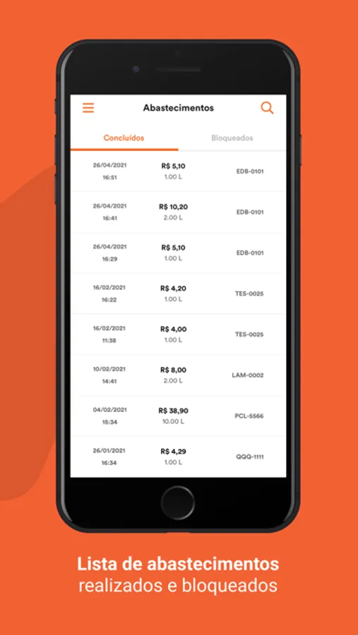 • Lista de abastecimentos realizados e bloqueados em ordem crescente;