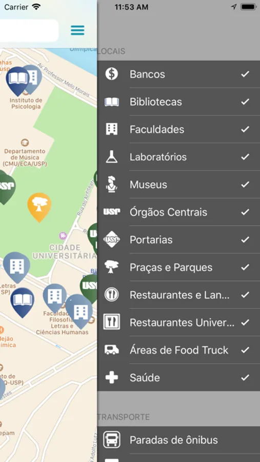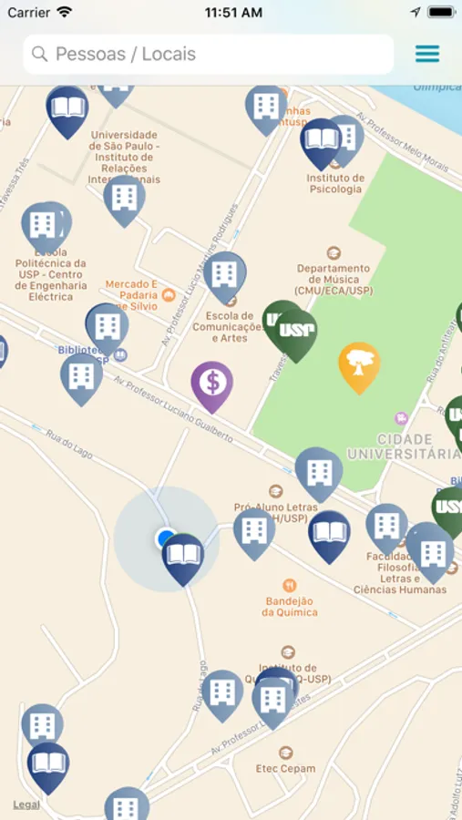 Agora ficou mais fácil se localizar na USP. Este guia o ajudará a encontrar as várias escolas, faculdades e institutos da Universidade de São Paulo, além de bibliotecas, restaurantes, bancos e muito mais. Também é possível localizar as rotas e as posições dos dois circulares da Cidade Universitária, em São Paulo, além de consultar os telefones de pessoas e de locais da USP.