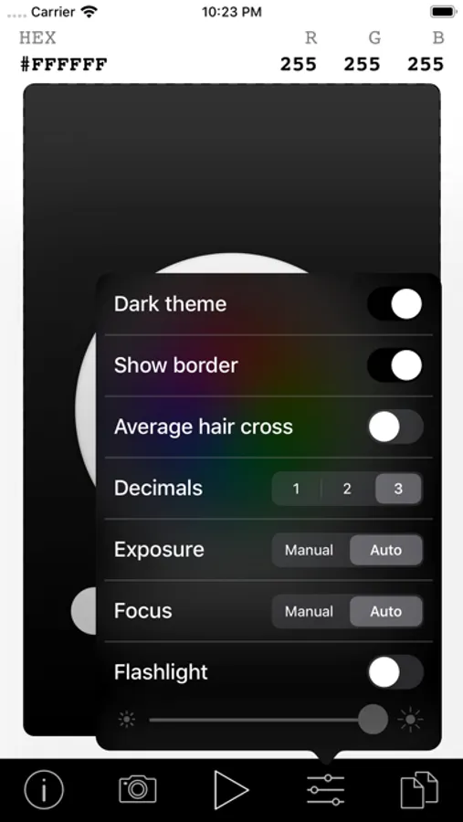 Simple options are available for focus and exposure control. You can set the torch (or flashlight) to a specific luminance to get the correct color balance before you pick it.
