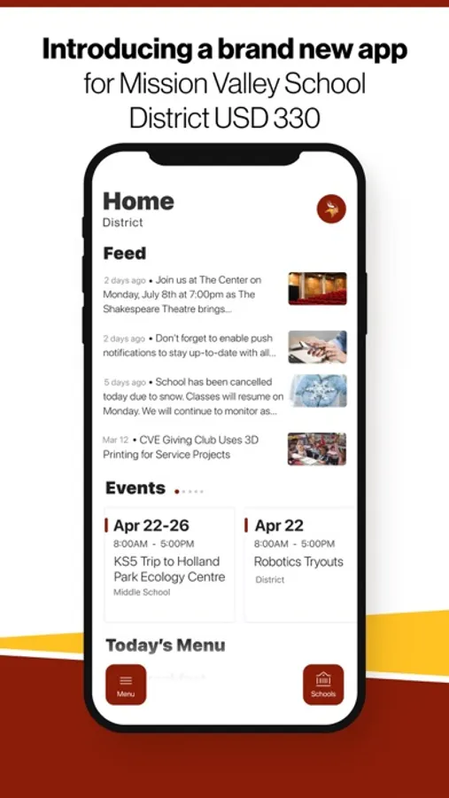 The event section shows a list of events throughout the district. Users can add an event to their calendar to share the event with friends and family with one tap.