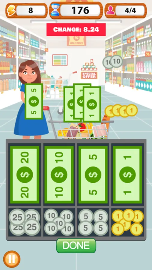 You can play in Timed Mode where you challenge your brain and time management to complete the levels. Or you can play in Untimed Mode so you can play in a leisurely manner with rhythm and flow. Choose from USD ($), Euro(€), British Pounds(£), or Canadian Dollars (C$) to challenge your brain even more. This is the most realistic cash register game on the market.