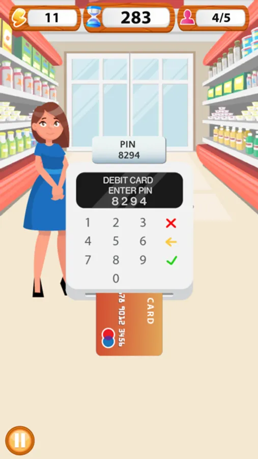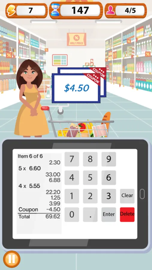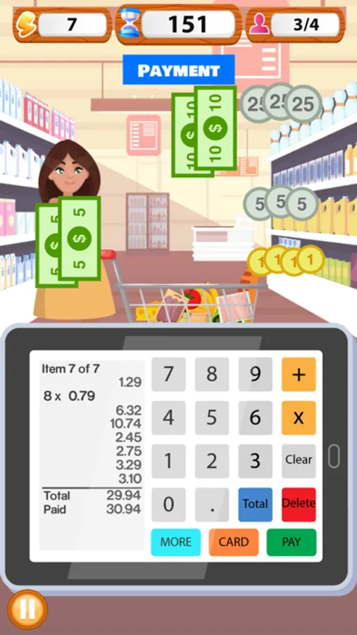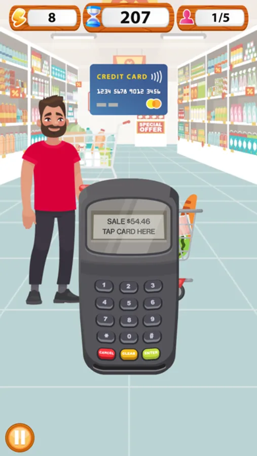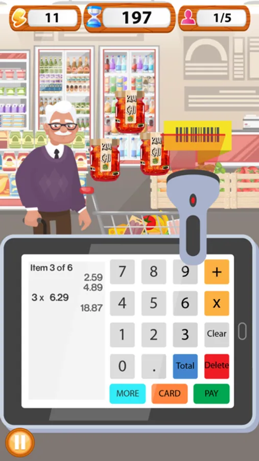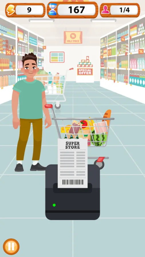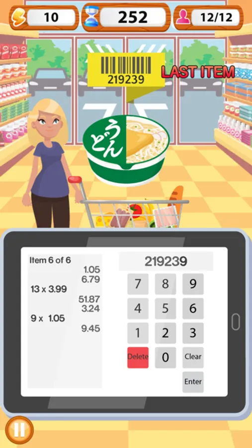 Use this game for your first job training or just exercise your brain to get fast at math and with time management. Calculate the change and make that grocery money. See if you can finish all the levels of Supermarket Cashier. Both kids and adults will find this cash register game fun and challenging. This is a cozy and relaxing game and cash register simulator.