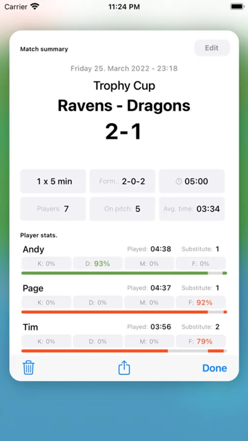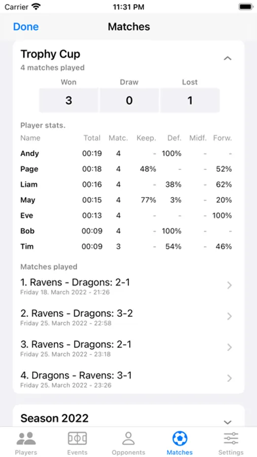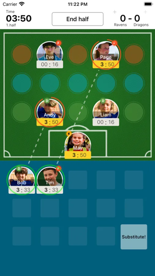 Track time and manage substitutions. Overview of positions and on-pitch time. List matches played with statistics. Also possible to export match summary. Can automatically suggest substitution.