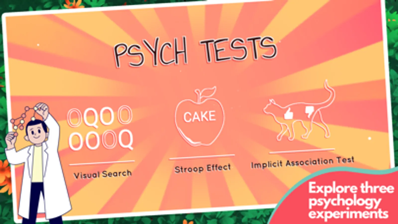 Run classic psychology experiments with Psych tests. Test your reaction speed with the Stroop Effect word game, explore the effects of distractors in the Visual Search mini game, and learn about unconscious biases in the Implicit Association Test.